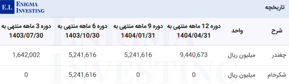 | شرح | دوره 12 ماهه منتهی به 1404/04/31 | دوره 12 ماهه منتهی به 1403/04/31 | دوره 12 ماهه منتهی به 1402/04/31 | دوره 12 ماهه منتهی به 1401/04/31 |