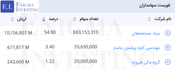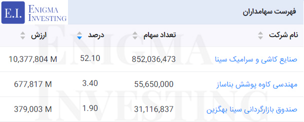 همچنین بیشترین بزرگترین سهامداران تلفیقی شرکت کاشی پارس در جدول زیر نمایش داده شده است. لازم به ذکر است که در سایت انیگما امکان مشاهده تمامی سهامداران عادی و تلفیقی نمادهای بورسی وجود دارد.