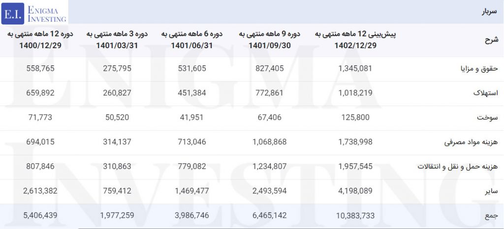 اقلام موردنظر در بخش سربار شرکت سپید ماکیان شامل حقوق و مزایا، استهلاک، سوخت، هزینه مواد مصرفی، هزینه حمل و… است. حقوق و مزایای شرکت با توجه به نرخ افزایش حقوق و دستمزد در سال 1403 (30 درصد) تا پایان سال جاری بیش از 303 میلیارد تومان و کل هزینه سربار حدود 2٬975 میلیارد تومان پیشبینی شده است. لازم به ذکر است که بخش زیادی از مبلغ سربار به آیتم سایر هزینهها اختصاص دارد. پیشبینی مبالغ آیتمهای سربار سپید در تصویر زیر ارائه شده است.