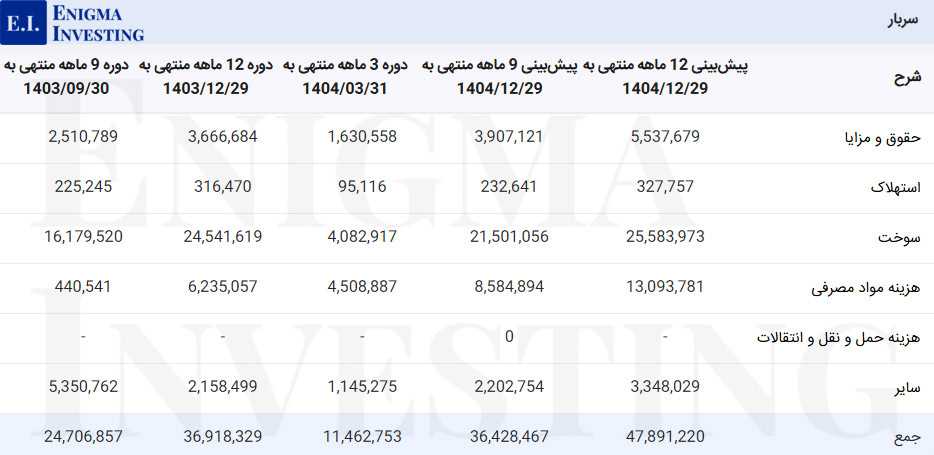 مطابق این تصویر سود خالص شرکت در سال مالی منتهی به 1403/12/30 برابر با 2,888 میلیارد تومان بوده است. این مبلغ نسبت به سال 1402 به اندازه 985 درصد افزایش داشته است. با در نظر گرفتن نرخ سوخت 70,080 ریالی و میانگین دلار 73,000 ریالی پیشبینی میشود که سود خالص این شرکت تا پایان سال مالی 1404 به 1,475 میلیارد تومان برسد.
