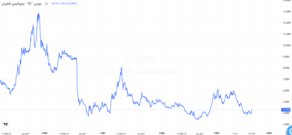 تصویر زیر روند قیمتی سهام شرکت پتروشیمی فناوران را از سال 1400 نشان میدهد. بالاترین قیمت این سهم در تاریخ 1400/09/03 برابر با 17,650 ریال بوده است. ارزش بازار شفن در این تاریخ 52 هزارمیلیارد تومان بوده است. باتوجه به ریزش قیمتی سهم شفن، در حال حاضر قیمت روز این سهم در تاریخ 7 مهرماه 1404 برابر با 4,274 ریال است. ارزش بازار شفن در تاریخ مذکور 13هزارمیلیارد تومان است.