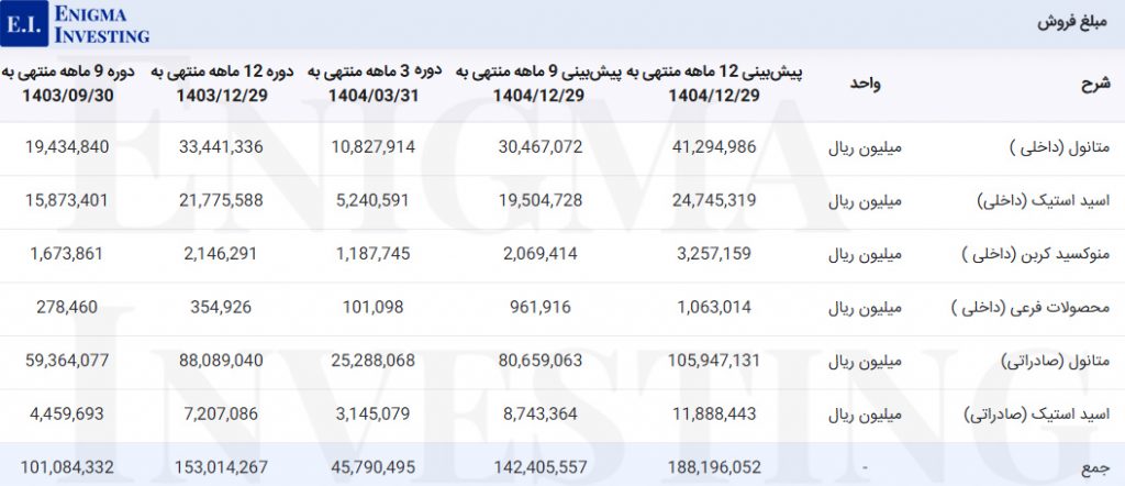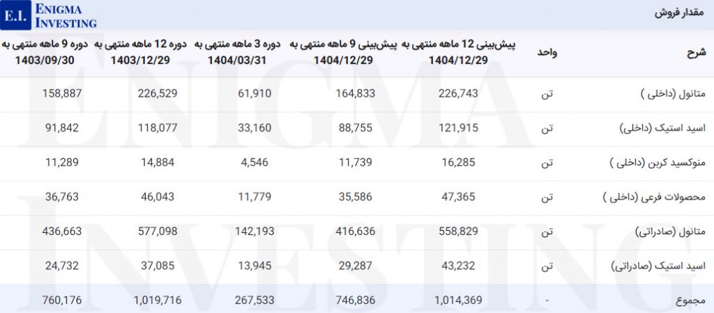 شرکت پتروشیمی فناوران سالانه یک میلیون تن متانول با درجه خلوص AA تولید میکند تا نیاز بازارهای داخلی و صادراتی را تامین کند. همچنین همزمان بخشی از تولید خود را بهعنوان متانول قابل مصرف داخلی، برای اسید استیک تولیدی خود استفاده میکند. در تصویر زیر مقدار فروش شفن در سه دوره مالی همراه با پیشبینی آن در سال مالی 1404 قابل مشاهده است. باتوجه به جدول زیر، شفن در سال مالی 1403 مقدار 1,019 هزارتن محصول به فروش رسانده و در دوره مالی 3 ماهه منتهی به 1402/03/31 نیز 267 هزارتن محصول به فروش رسانده است. پیشبینی میشود مقدار فروش این شرکت تا پایان سال مالی منتهی به 29 اسنفدماه 1404 به 1,014 هزارتن برسد.
