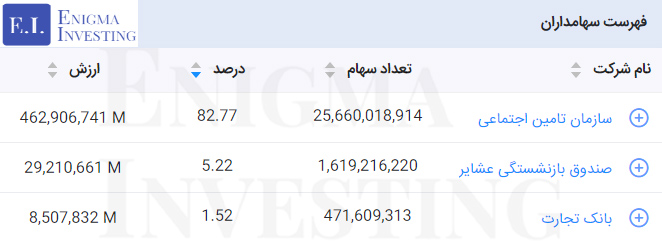 دیگر سهامداران حقیقی و همچنین حقوقیهای زیر یک درصد که در کدال گزارش داده شده است نیز بهصورت عادی و تلفیقی در محصول سهامداران انیگما قابل مشاهده است. در حالت تلفیقی هر شرکت با شرکت مادر خود نمایش داده میشود. در تحلیل بنیادی تاصیکو سازمان تامین اجتماعی بهصورت تلفیقی و بههمراه زیرمجموعههای خود بیش از 69 درصد از سهام این شرکت را در اختیار دارد.